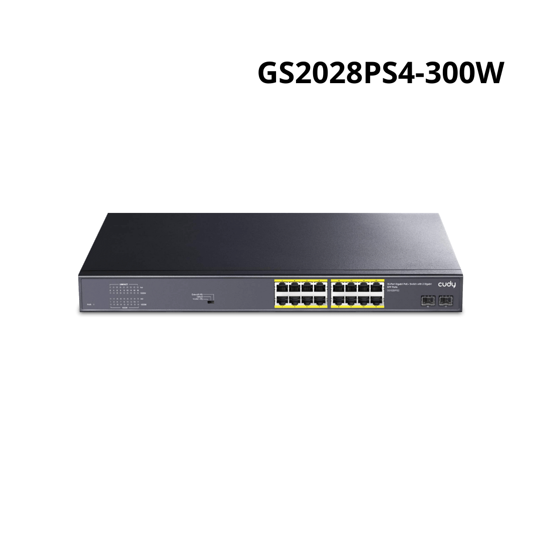 Cudy GS2028PS4 est un switch Gigabit PoE+ géré de couche 2 haute performance, conçu pour les réseaux d’entreprise et les déploiements PoE les plus exigeants. Ce switch PoE+ géré, le Cudy GS2028PS4, offre 24 ports RJ-45 Gigabit Ethernet (10/100/1000 Mbps) supportant les normes PoE+ (IEEE 802.3at) et PoE (IEEE 802.3af), avec une puissance maximale de 30W par port et un budget total de 300W. Il est idéal pour alimenter un grand nombre d’appareils tels que des caméras de surveillance IP, des points d’accès Wi-Fi, des téléphones VoIP et d’autres périphériques compatibles PoE.