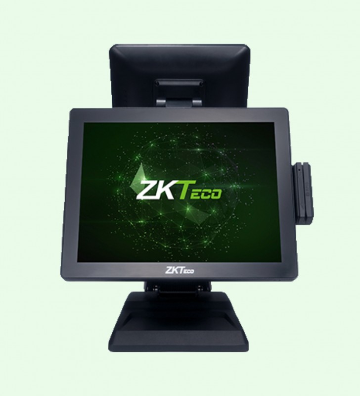 Le ZKBio930 Standard avec 4 Go de RAM et SSD de 64 Go, scanner de codes à barres 2D, MSR, VFD et le deuxième écran peut être ajusté en angle, installation et maintenance plus rapides